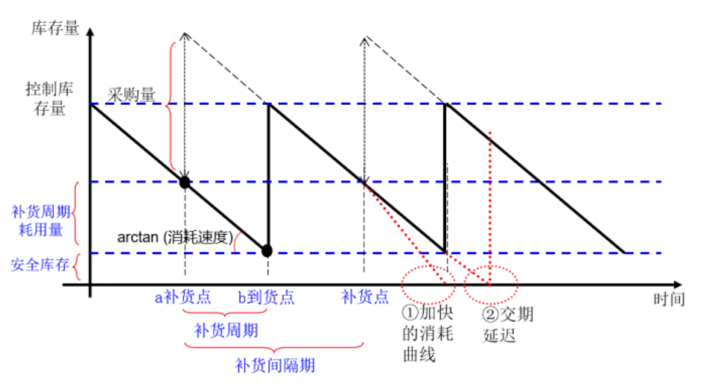 对于实际物料消耗速度的变化又有比预设消耗速度变慢和变快两种情况(即需求变少和需求变多)。如果是消耗速度变慢,则补货点会被推后 (因为 补货周期耗用量=消耗速度*补货周期,消耗变慢,则对应的补货周期的耗用量减少,则对应的补货点必然会延后),不会导致缺货,同时库存仍然在0~控制库存点之间。